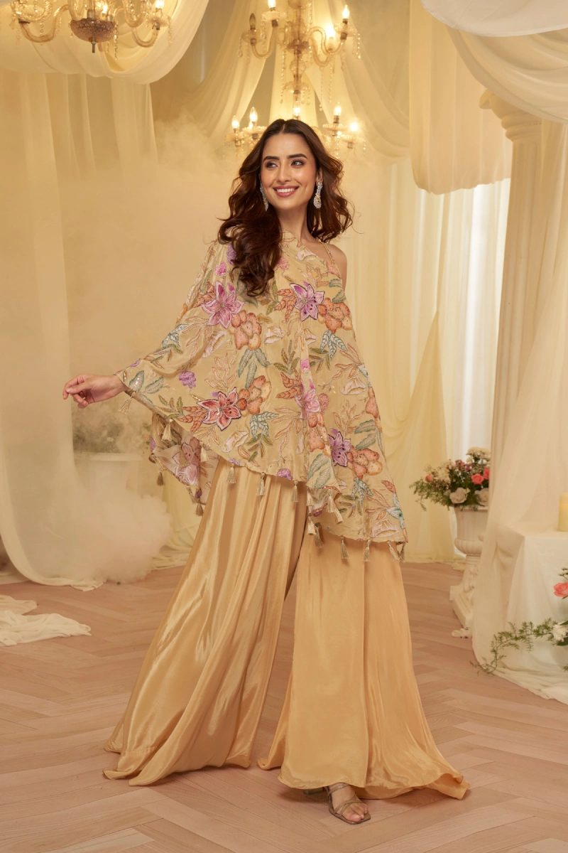 tep out in sophisticated style with this monochrome Beige ensemble. Designed for the modern woman, the set includes a Short Top and matching Palazzo pants. The high-quality Viscose fabric is accented with detailed Embroidered, Sequins, and Printed embellishments, making it perfect for festive occasions. The interior is finished with a soft Crepe lining for all-day wearability.