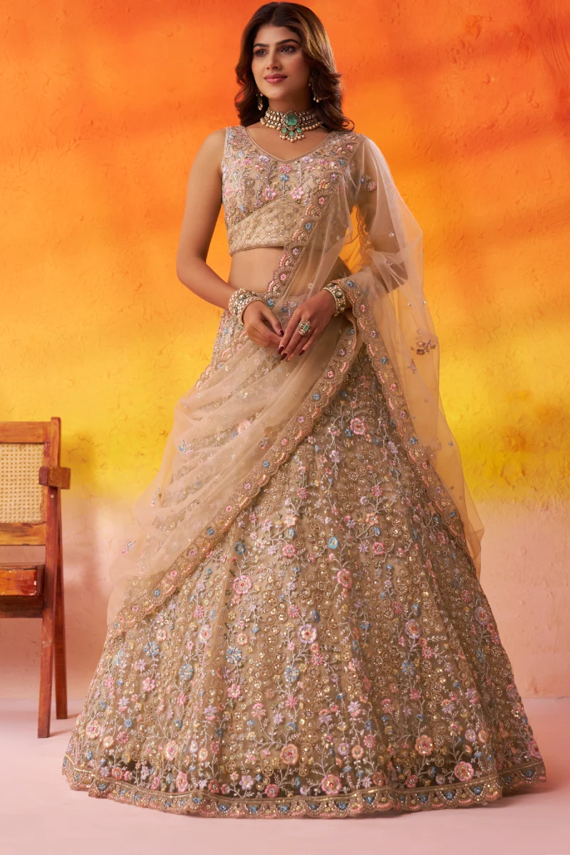 This timeless beige lehenga set is designed in premium net fabric and enhanced with sequins, stone detailing, coding, and thread embroidery. The lehenga is finished with a refined cutwork embroidered border and structured with a shantoon inner, layered can-can, and buckram for a flowing silhouette. It is paired with a matching net blouse featuring a V-neckline, heavy embroidery, and attached shantoon lining. The beige net dupatta with heavy coding and embroidery cutwork borders adds a graceful finishing touch.