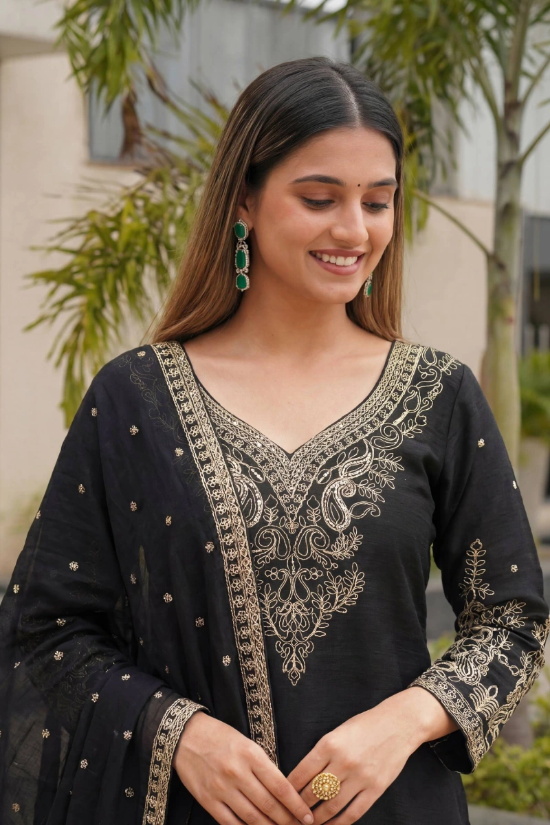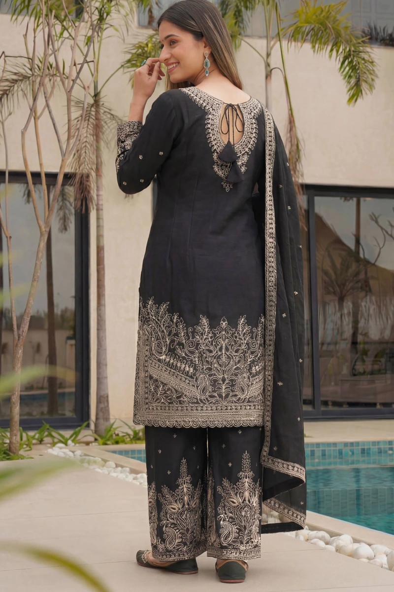 A classic black Chinon embroidered palazzo suit styled with a matching dupatta. The elegant embroidery and 40-inch top length create a timeless ethnic look suitable for evening events and festive gatherings.