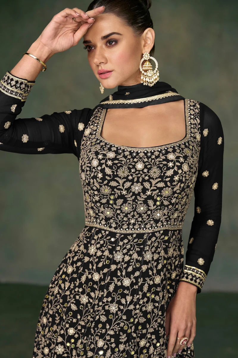 This Black Georgette Anarkali Gown is a perfect blend of elegance and festive glamour. Crafted in premium georgette and paired with a soft santoon lining, it features detailed mirror work, zari highlights, thread embroidery, and shimmering sequins. The matching georgette dupatta completes the regal look. Ideal for weddings, receptions, sangeet, and evening celebrations.