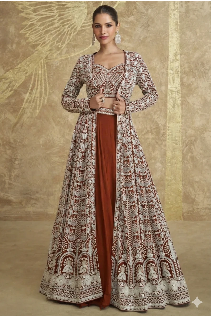 This striking black lehenga set is crafted from luxurious real georgette fabric and features an elegant embroidered jacket. With its flowing silhouette and intricate detailing, this jacket-style lehenga is perfect for formal occasions and celebrations. Make a bold statement with this sophisticated ensemble