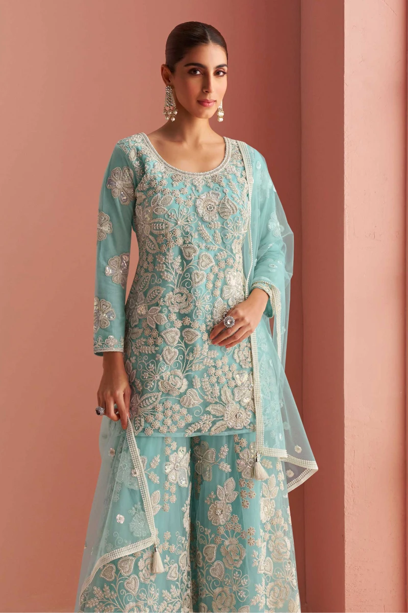 Elegant and timeless, this blue palazzo set features a straight-cut top crafted from fine net fabric, with matching net sleeves, palazzo, and dupatta. Detailed embroidery enhanced with sequins and beadwork adds a touch of glamour, while the shantoon lining ensures comfort and structure. With a 32-inch top length and a sleek silhouette, this set is perfect for festive wear, parties, and special occasions.