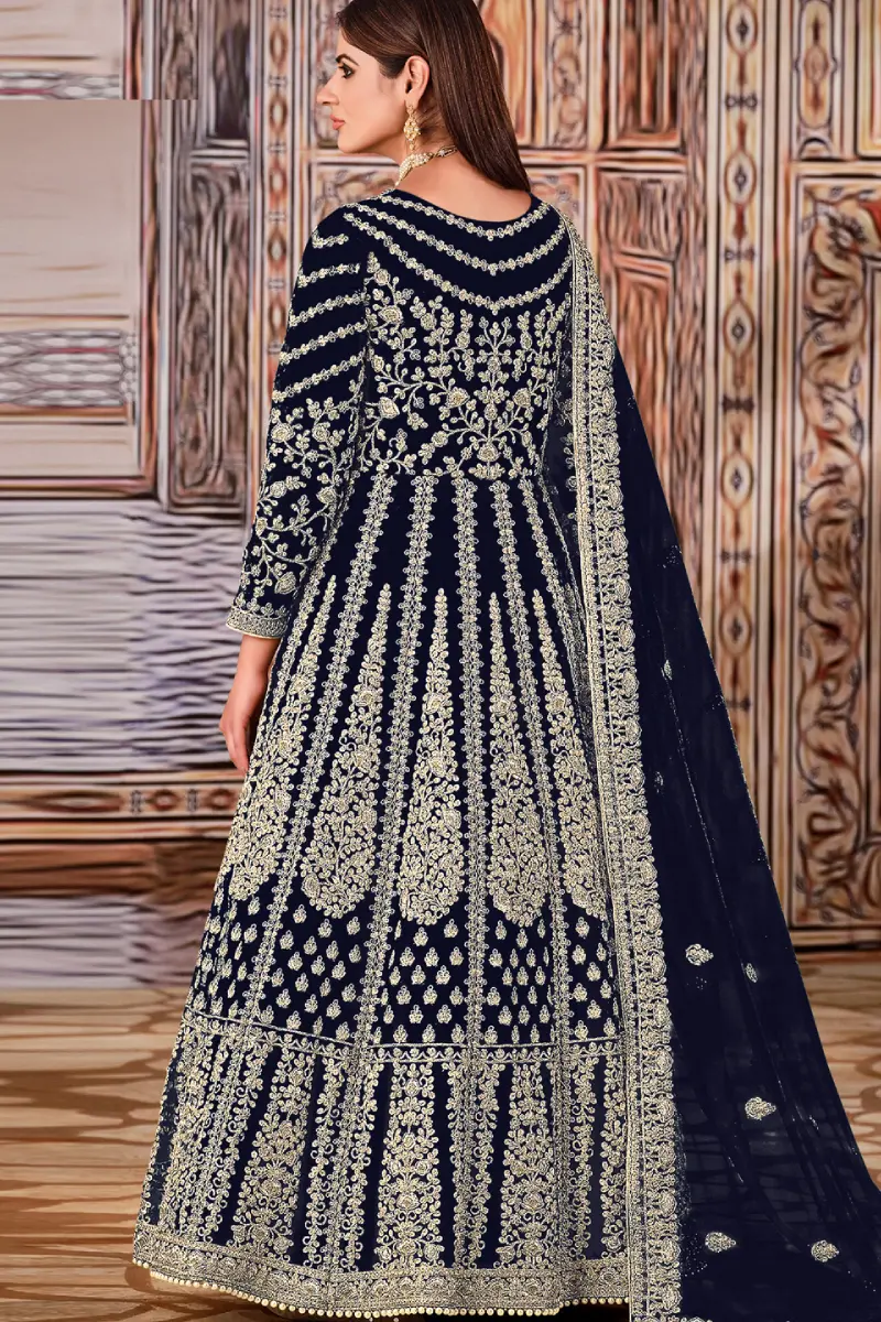This Blue Anarkali blends festive elegance with shimmering sequins and intricate embroidery on soft Net fabric. A perfect ensemble for special celebrations.
