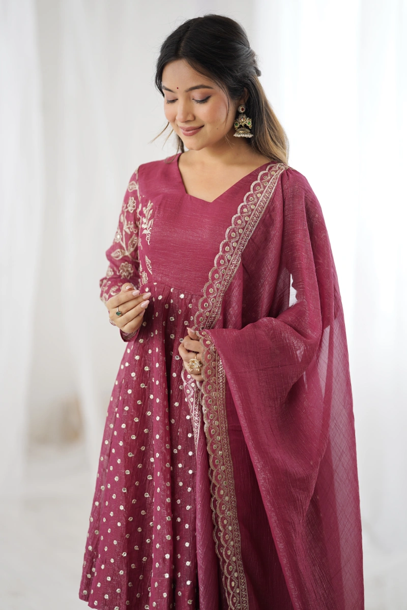 Designed for a regal and graceful appeal, this burgundy palazzo suit features premium crunchy silk fabric with intricate embroidered detailing. The 36-inch top is styled with a comfortable palazzo and a matching dupatta, creating a sophisticated ensemble ideal for celebrations and traditional events.