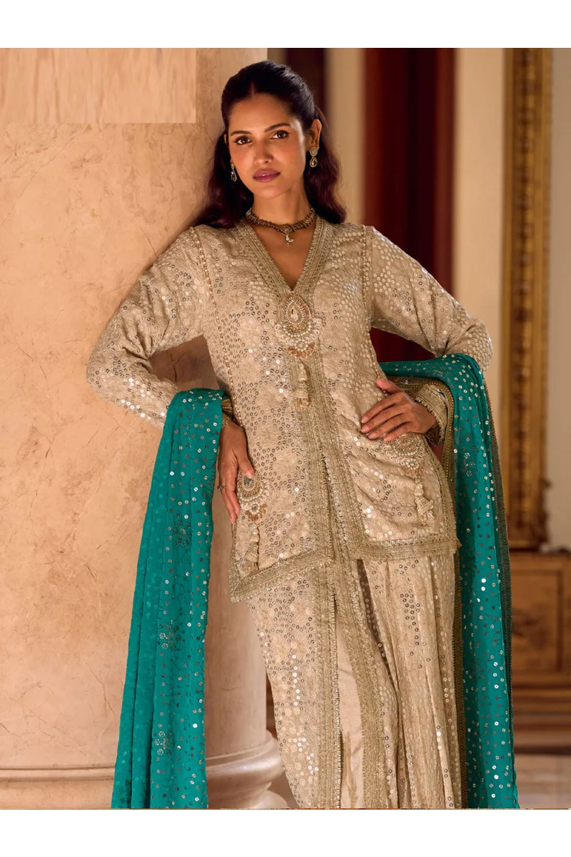 This champagne sequin kurta set paired with an emerald green dupatta blends traditional craftsmanship with modern sophistication. The ensemble includes coordinated draped pants embellished with sequins, adding texture and dimension. The emerald green dupatta adorned with scattered sequin accents provides a refreshing contrast, bringing vibrancy to the neutral champagne base.