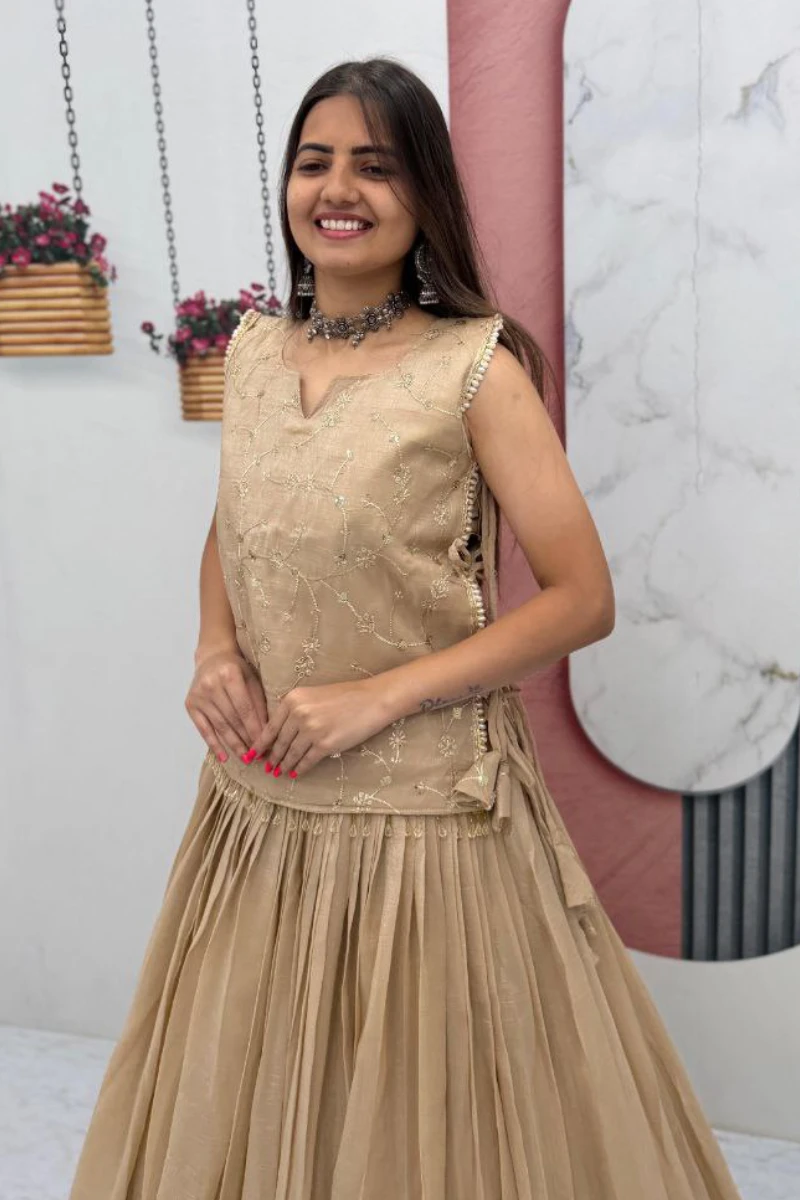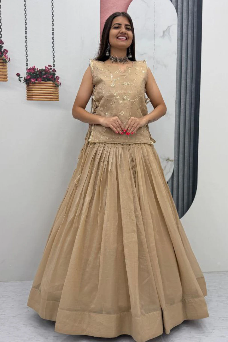 This elegant lehenga choli set is crafted from premium crunchy silk fabric, designed to offer a rich and festive appearance. The sleeveless embroidered choli adds a modern touch while maintaining traditional charm, beautifully paired with a flowing lehenga and a stylish matching jacket. The Chiku Gold color enhances the regal appeal, making it a perfect choice for weddings, festive celebrations, and special occasions where sophistication meets contemporary ethnic style.