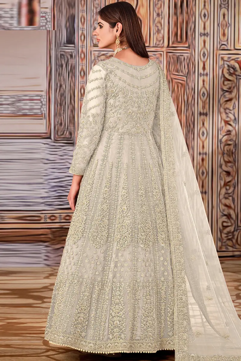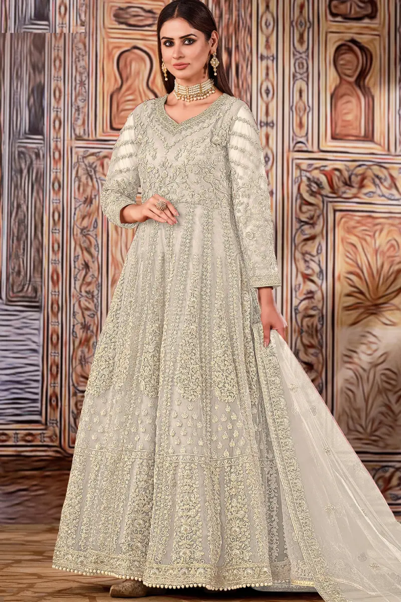 A graceful Cream Anarkali adorned with delicate embroidery and sequins work. Lightweight Net dupatta and soft santoon bottom ensure comfort and elegance for any occasion.