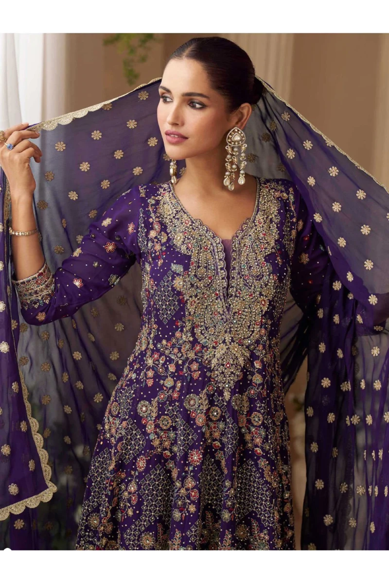 Add a vibrant touch to your festive collection with this stunning pink Anarkali suit, beautifully paired with royal blue accents. Crafted in soft georgette fabric, the kurta features intricate sequin and zarkan embroidery that lends a rich, festive shimmer. The elegant Anarkali silhouette is complemented by matching royal blue palazzo pants, offering both comfort and style. A graceful royal blue dupatta with delicate detailing enhances the overall look, creating a striking color contrast.
