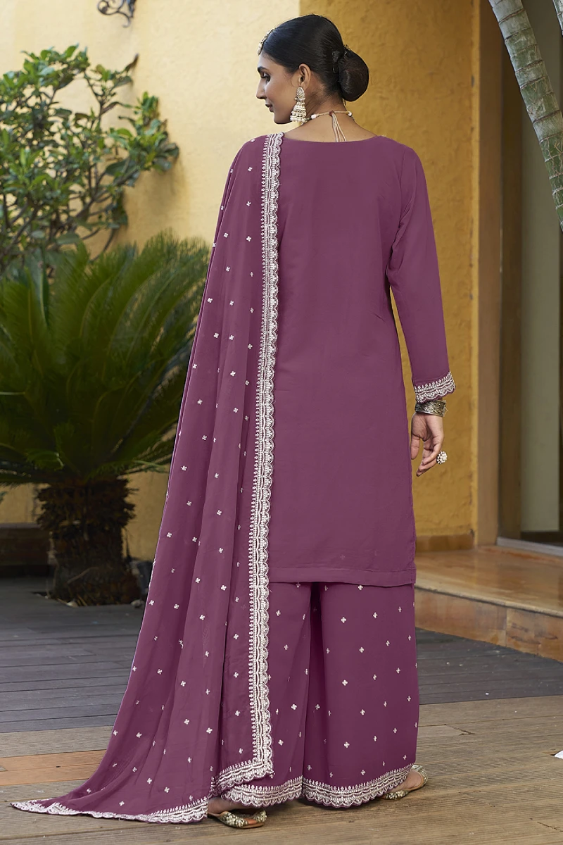 This Dusty Pink Palazzo Suit offers a graceful and contemporary ethnic look. Made in smooth georgette with a comfortable santoon lining, the set features intricate embroidery, resham work, and subtle sequins that add a touch of sparkle. The flowy palazzo and matching embroidered georgette dupatta make it ideal for festive gatherings, day functions, and family events.