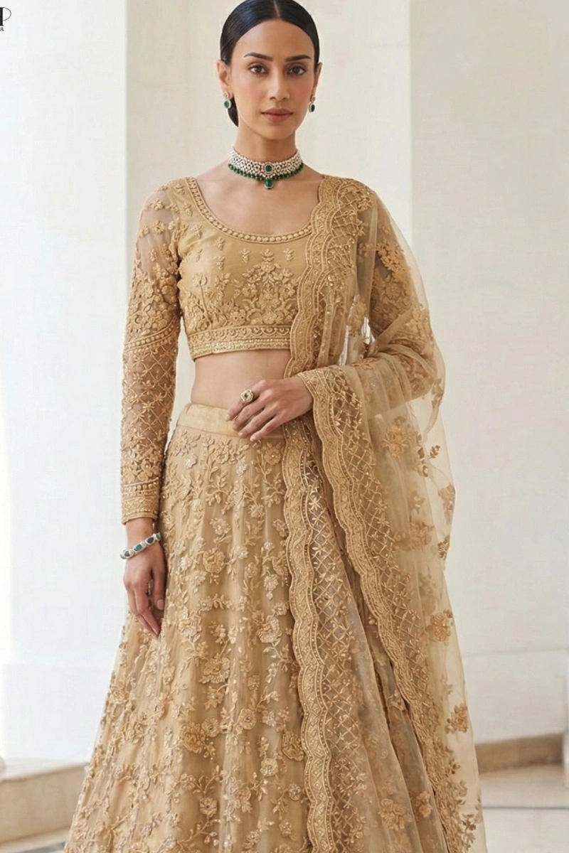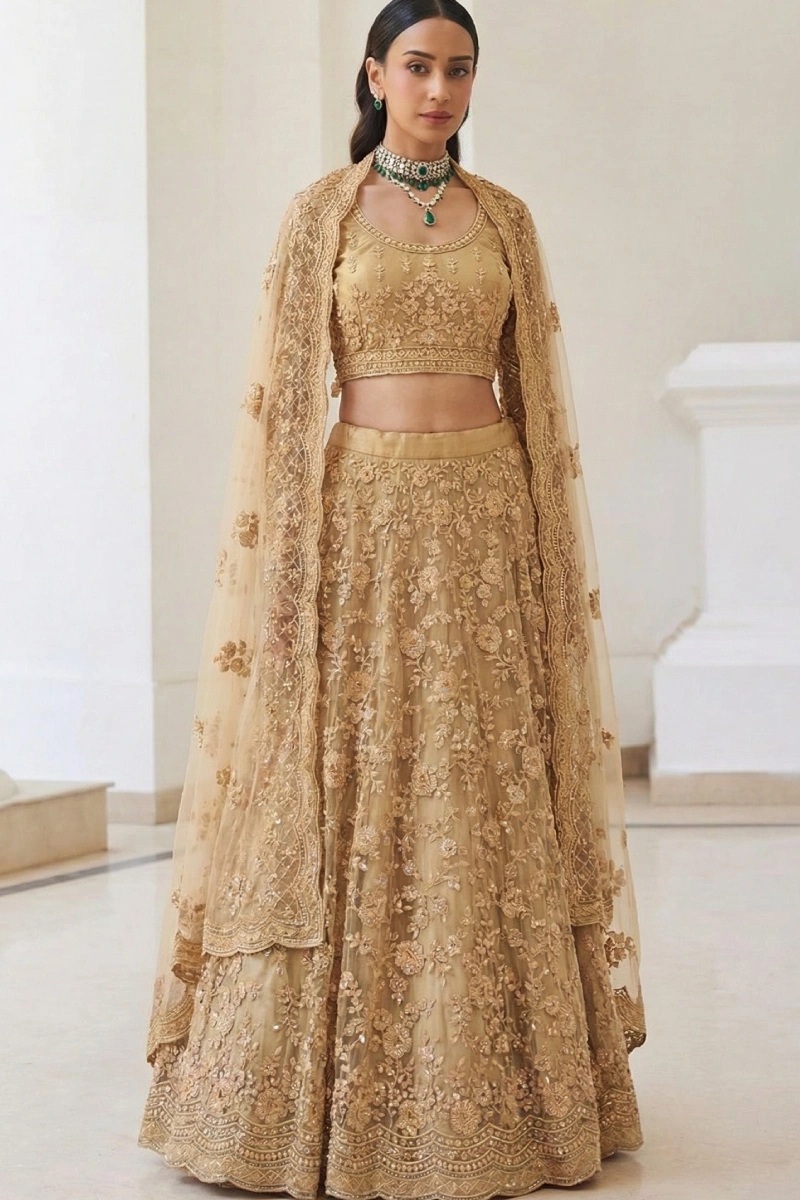 Crafted in a rich golden tone, this butterfly net lehenga choli is adorned with full embroidery that adds a grand and glamorous touch. The matching embroidered dupatta completes the ensemble, making it a perfect choice for party wear, wedding functions, and festive occasions.