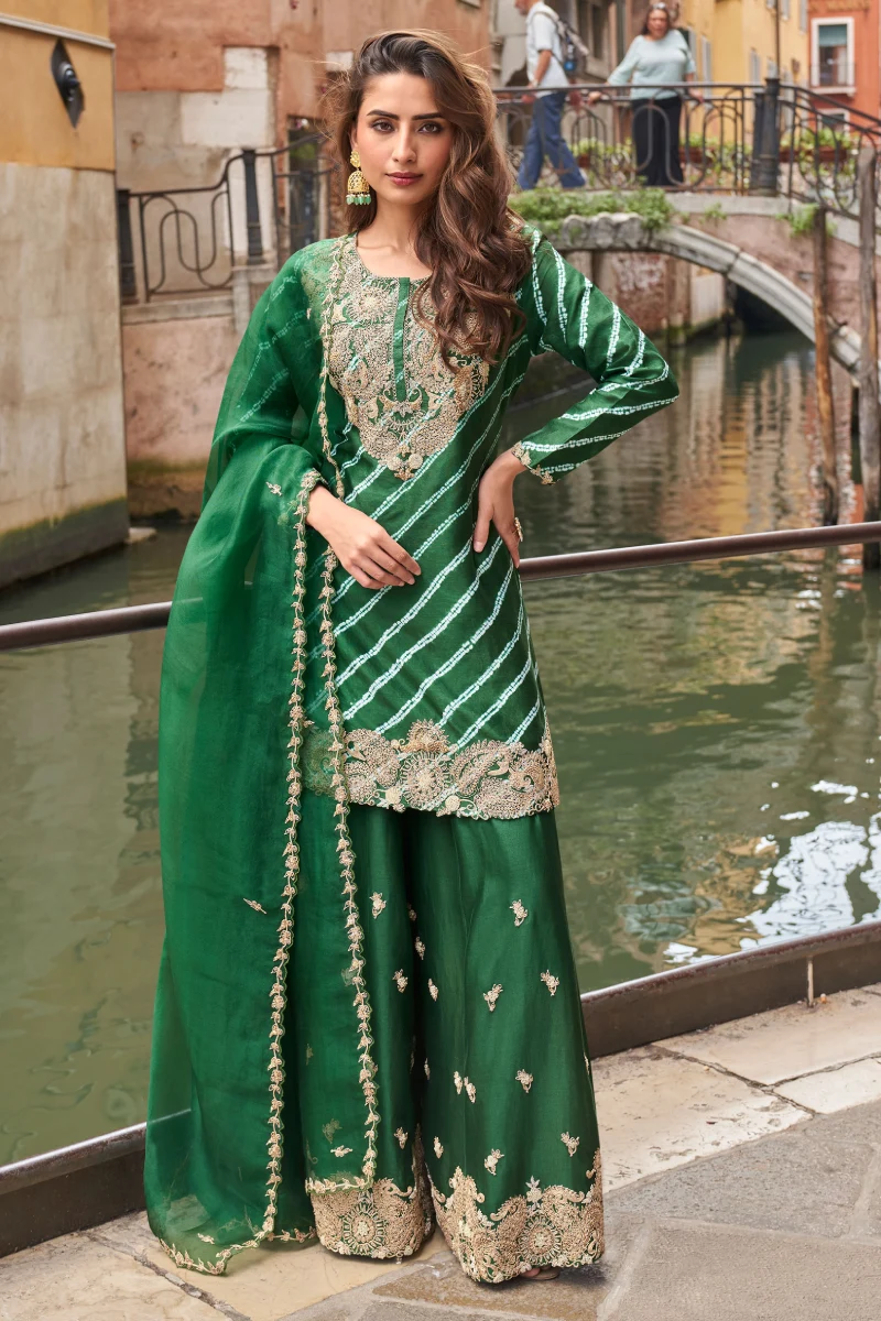 Designed for a refined and classy look, this green palazzo set is made entirely from premium chinon silk with shantoon lining for added comfort. The straight-style 32-inch top is beautifully detailed with zari embroidery, sequins, stone work, and digital prints, creating a rich and elegant finish. Completed with a matching palazzo and dupatta, this outfit is ideal for festive gatherings and special occasions.