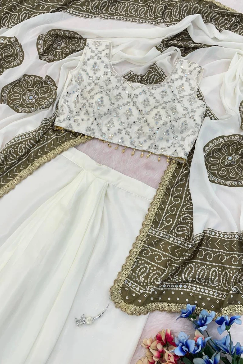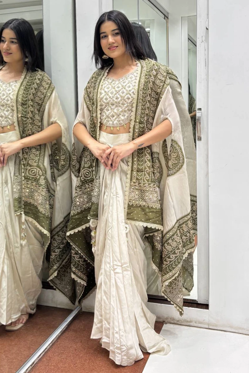 This elegant ensemble features a richly embroidered Mehendi green choli paired with a graceful cream dhoti-style skirt, creating a perfect blend of tradition and contemporary charm. The choli is crafted in luxurious Banglory silk, while the dhoti skirt and dupatta are made from soft, flowy chinon fabric. Accented with fine embroidery, this outfit is ideal for festive occasions, weddings, and celebratory gatherings where effortless style meets comfort.
