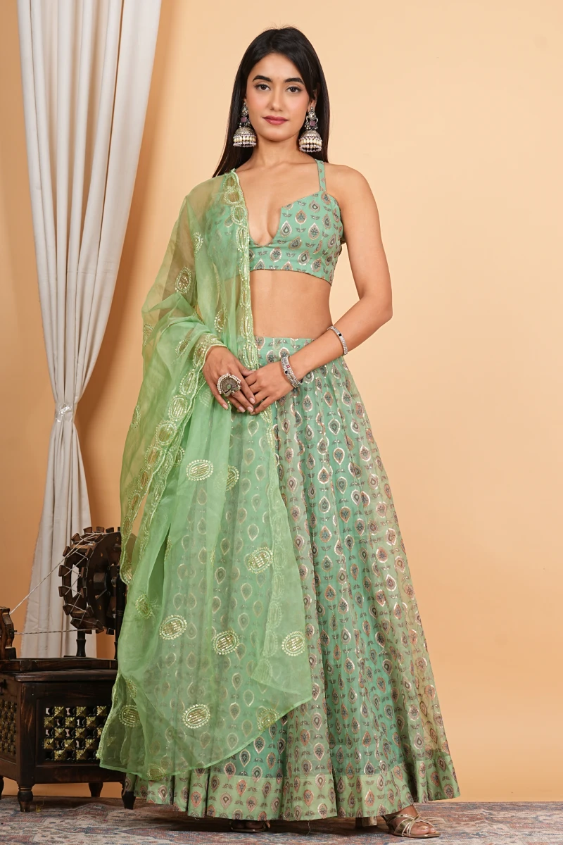 A graceful green organza lehenga set designed with attractive digital prints and highlighted with sequins embroidery. The soft sheen and flowy silhouette create a refined festive look suitable for weddings and special celebrations.