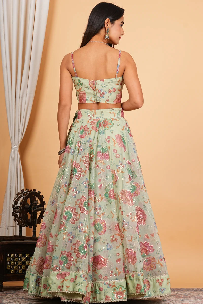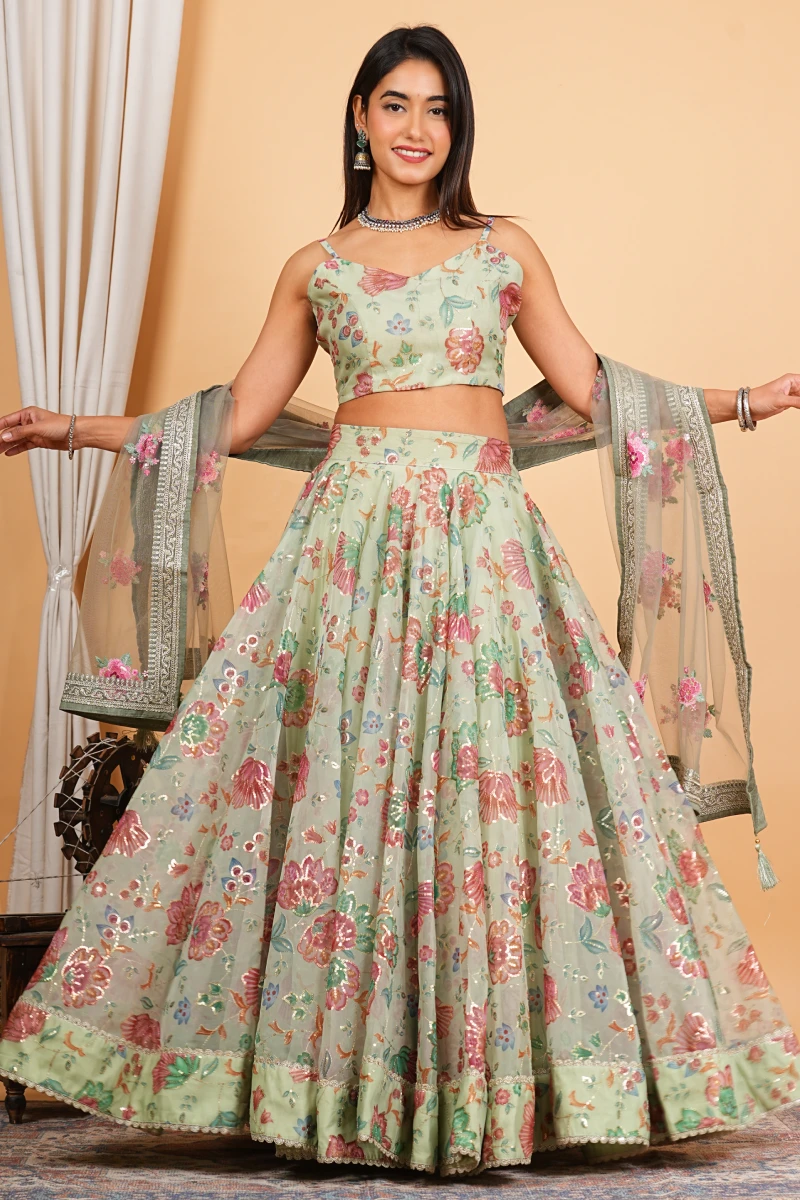 Designed in a refreshing green shade, this organza lehenga set showcases beautiful digital prints accented with shimmering sequins and fine lace work. The airy organza fabric adds a graceful flow, making it ideal for festive gatherings and stylish occasions.