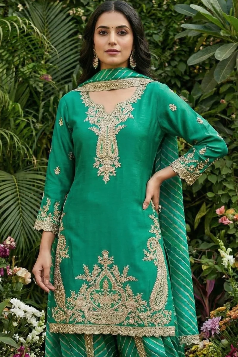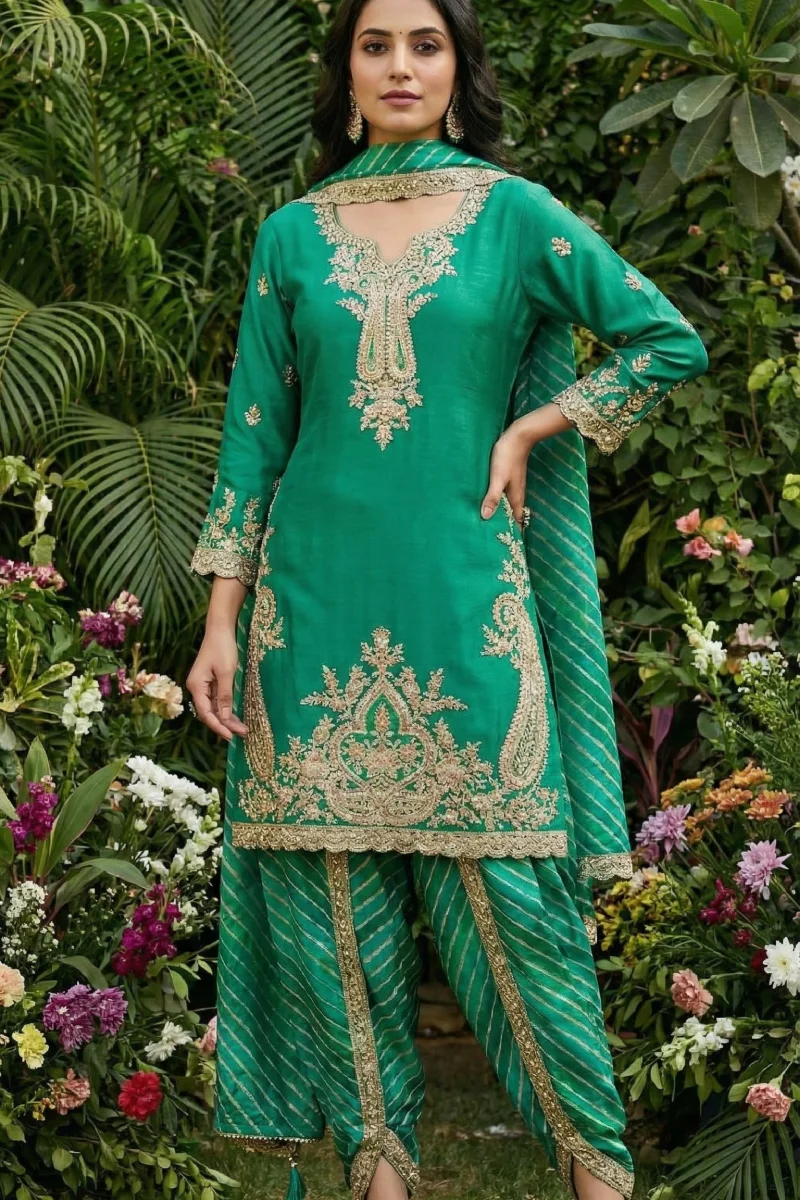 This elegant green dhoti style suit is made from heavy premium chinon, highlighted with detailed embroidery on both sides of the top. The digitally printed chinon dhoti bottom with front embroidery adds depth and character to the ensemble. Finished with a heavy premium chinon dupatta adorned with digital prints, four-side embroidery, and latkans, it offers a perfect blend of tradition and modern style.