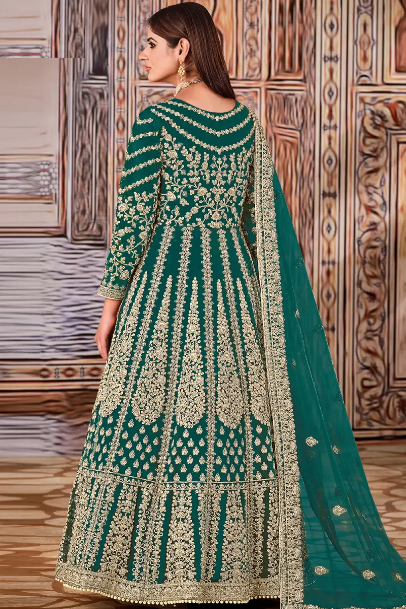 Fresh and vibrant, this Green Net Anarkali showcases beautiful embroidered motifs with a sequinned finish. A perfect pick for festivities and family functions.