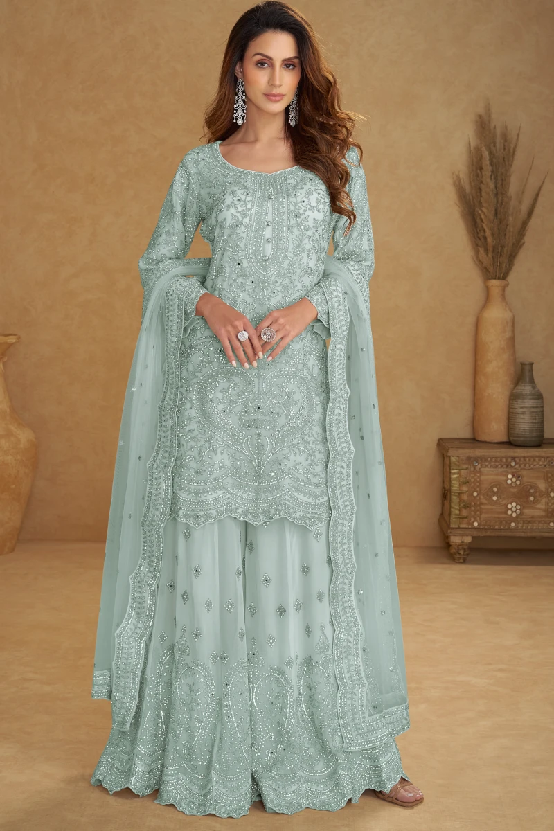 This rich green palazzo suit showcases a real net top and dupatta combined with a pure net palazzo, beautifully enhanced with embroidery and hand work. With a top length of 38–40 inches, the outfit delivers a flowy and sophisticated look, ideal for festive wear and celebratory occasions.