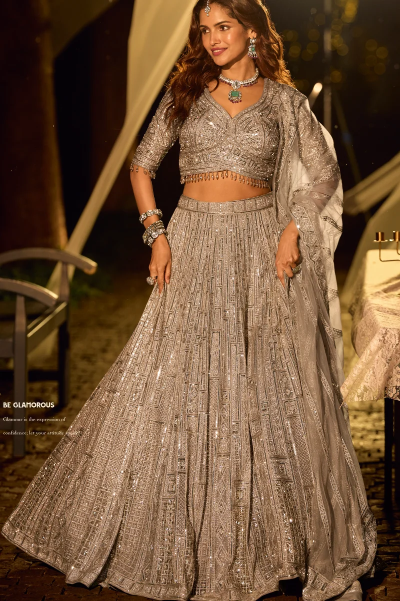 This sophisticated grey lehenga choli set is made from pure net fabric and beautifully decorated with full heavy hand embroidery. Featuring beads, pearls, mirrors, and Swarovski hand diamond work on both front and back, along with cancan for added structure, this ensemble is perfect for modern partywear and elegant festive styling.