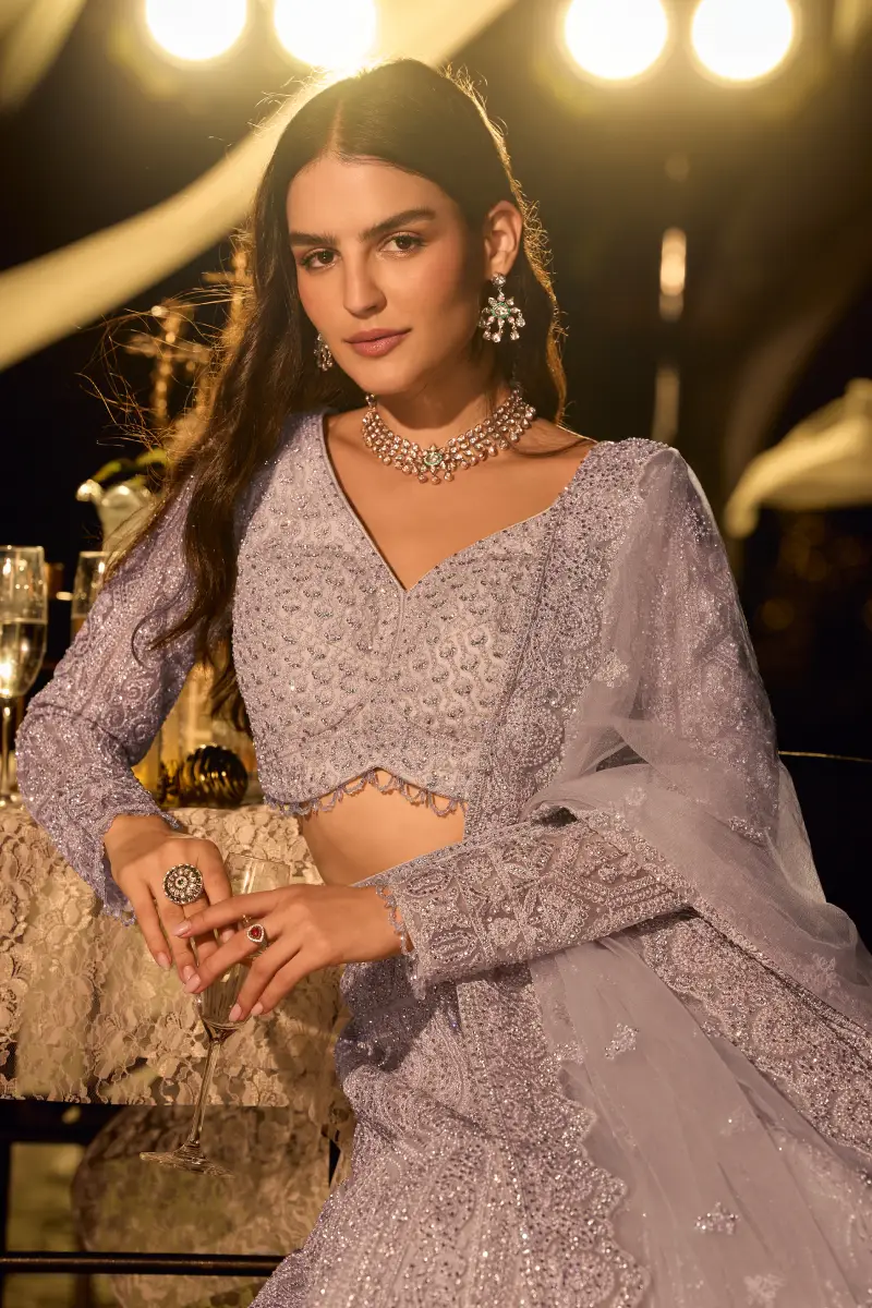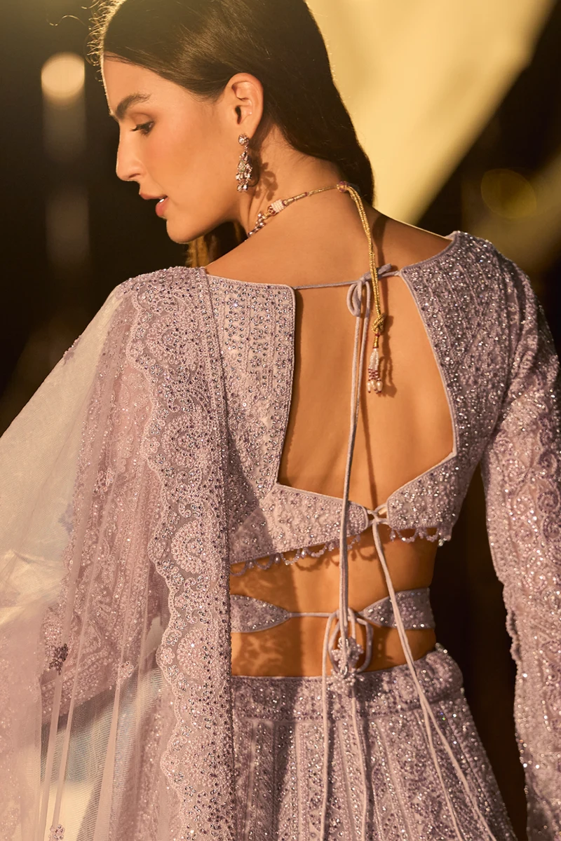 Designed in a soft lavender hue, this pure net lehenga choli features full heavy handwork using beads, pearls, mirror accents, and Swarovski hand diamonds. The intricate embroidery on both front and back adds exceptional elegance, while the cancan gives the lehenga a dramatic, structured flair. Ideal for evening functions and statement festive looks.