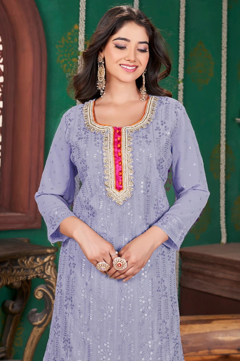 This Light Purple Garara Set brings refreshing sophistication to your ethnic collection. Crafted in premium Georgette, the outfit features delicate embroidery enhanced with sequins work for a subtle sparkle. The soft organza dupatta drapes beautifully, completing the look with finesse. Perfect for festive occasions, the set comes with Dull Santoon lining for added comfort and a flawless silhouette.