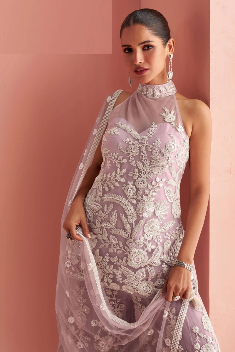 This graceful lilac palazzo set is designed in delicate net fabric for the top, sleeves, bottom, and dupatta, complemented with a soft shantoon lining for comfort. The straight-cut top is beautifully adorned with embroidery highlighted by sequins and beads, creating an elegant and festive look. Paired with a matching net palazzo and dupatta, this 32-inch straight top ensemble is ideal for parties, festive occasions, and evening celebrations.