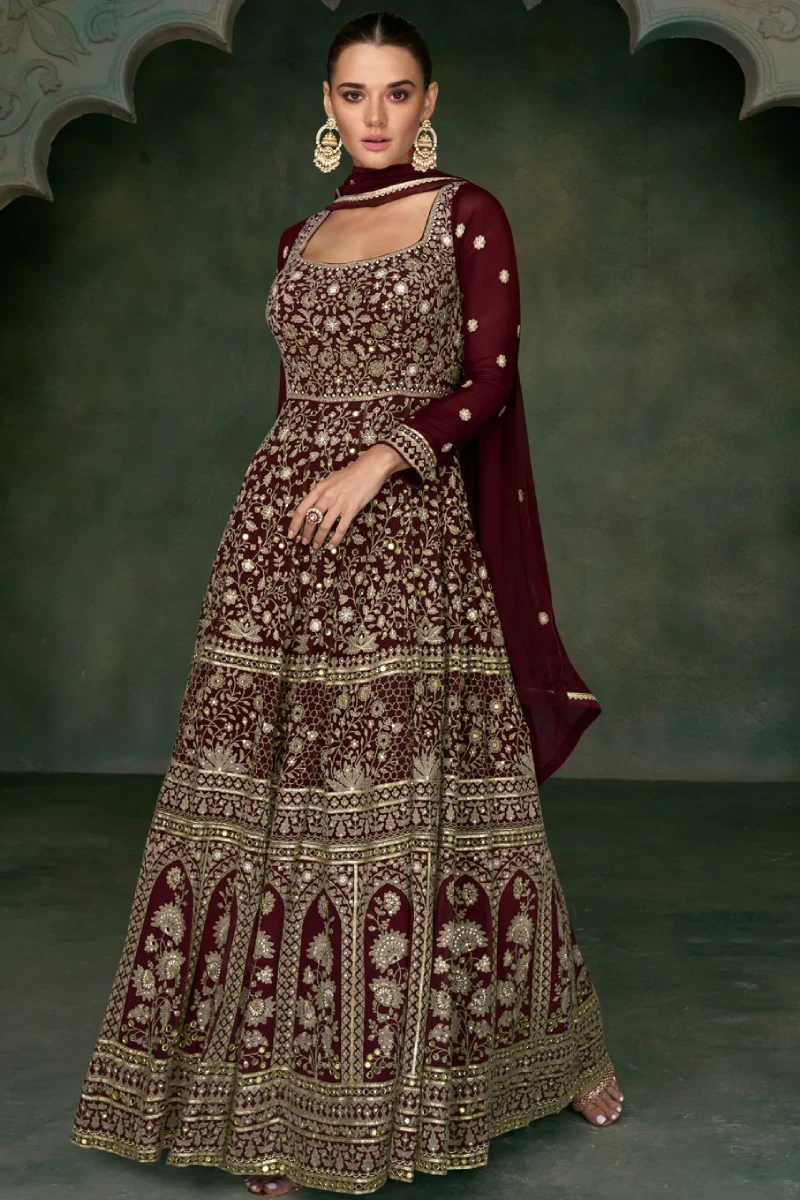 Elevate your festive wardrobe with this rich Maroon Georgette Anarkali Gown. Designed with mirror work, zari embroidery, thread detailing, and sequins, it exudes traditional charm with modern finesse. The santoon lining ensures comfort, while the matching georgette dupatta enhances the royal silhouette. Perfect for parties, festivals, and wedding functions.