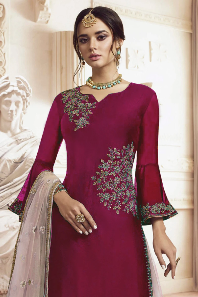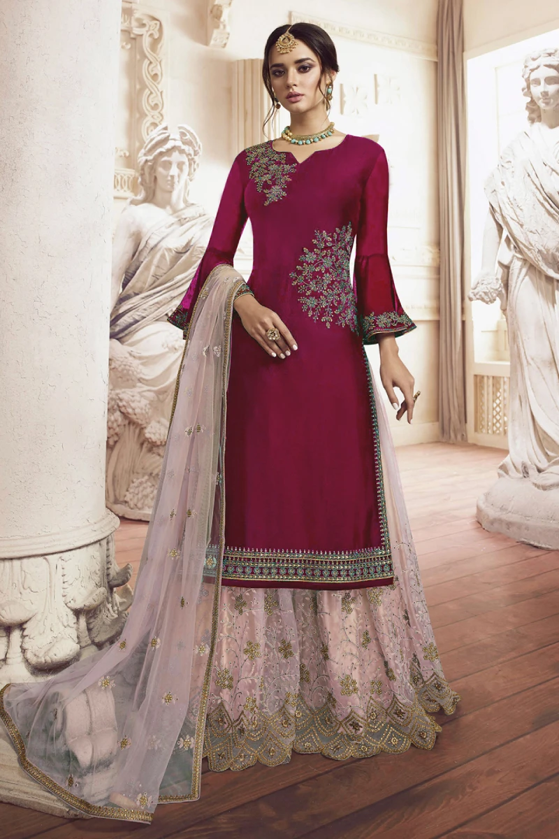 This Maroon Palazzo Set exudes traditional charm with modern flair. The Rangoli Georgette top is enriched with embroidery, sequins, and stone work that add a luminous finish. A soft Net palazzo and matching Peach Net dupatta complete the look, creating a perfect blend of beauty and comfort. Suitable for festive wear and wedding functions.