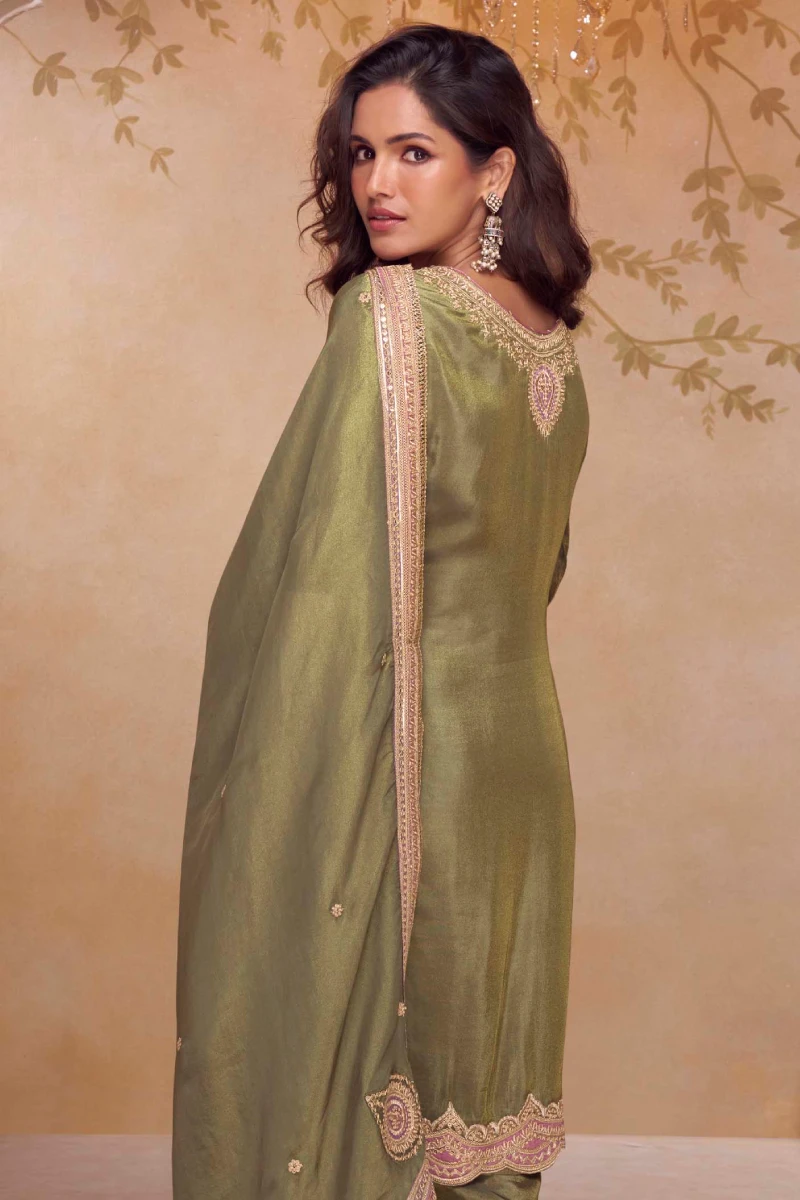 Graceful and festive, this Mehendi Green Simar Silk salwar suit features beautiful embroidery and full sleeves. Paired with a matching bottom and a coordinated dupatta, this elegant outfit is perfect for weddings and celebrations.