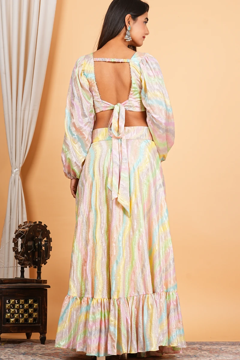 Vibrant and trendy, this multi-color lehenga set is crafted in soft chinon fabric with striking digital prints. Its lively hues and elegant drape make it a perfect statement outfit for festive functions and parties.