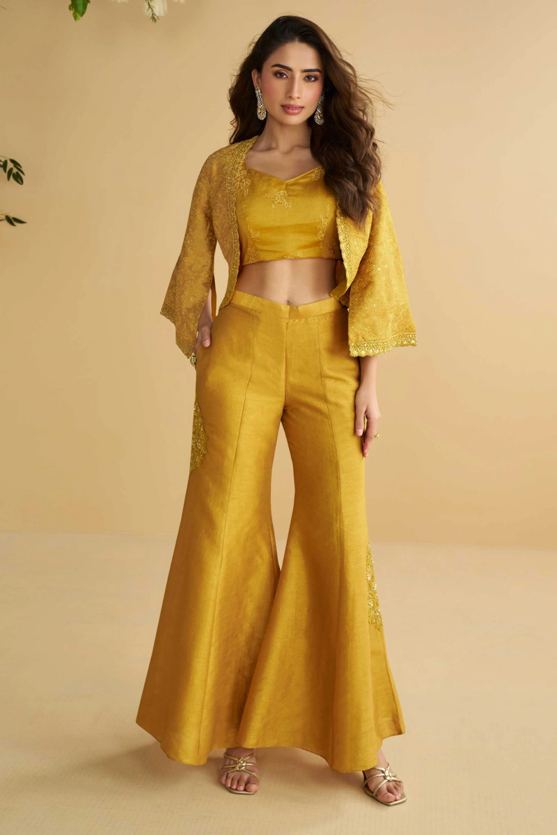 This elegant mustard ensemble features a finely embroidered silk blouse paired with a matching silk palazzo and a coordinated silk jacket. Adorned with delicate embroidery, sequins, and beadwork, the outfit offers a rich festive appeal. The blouse comes in a stylish short length of 15 inches, while the jacket adds a graceful layered look with a 20-inch length. Finished with a comfortable shantoon lining, this set is perfect for festive occasions, weddings, and special celebrations.