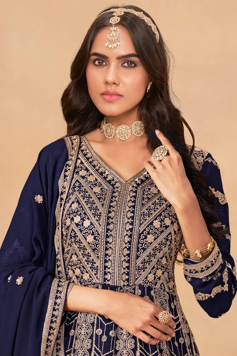Add sophistication to your ethnic look with this Navy Blue Faux Georgette Anarkali Gown. The long flared silhouette features delicate embroidery, making it perfect for evening occasions and festive gatherings. The ensemble includes a santoon inner and bottom for a soft, comfortable fit, and a flowy 2.4-meter georgette dupatta that completes the royal look.