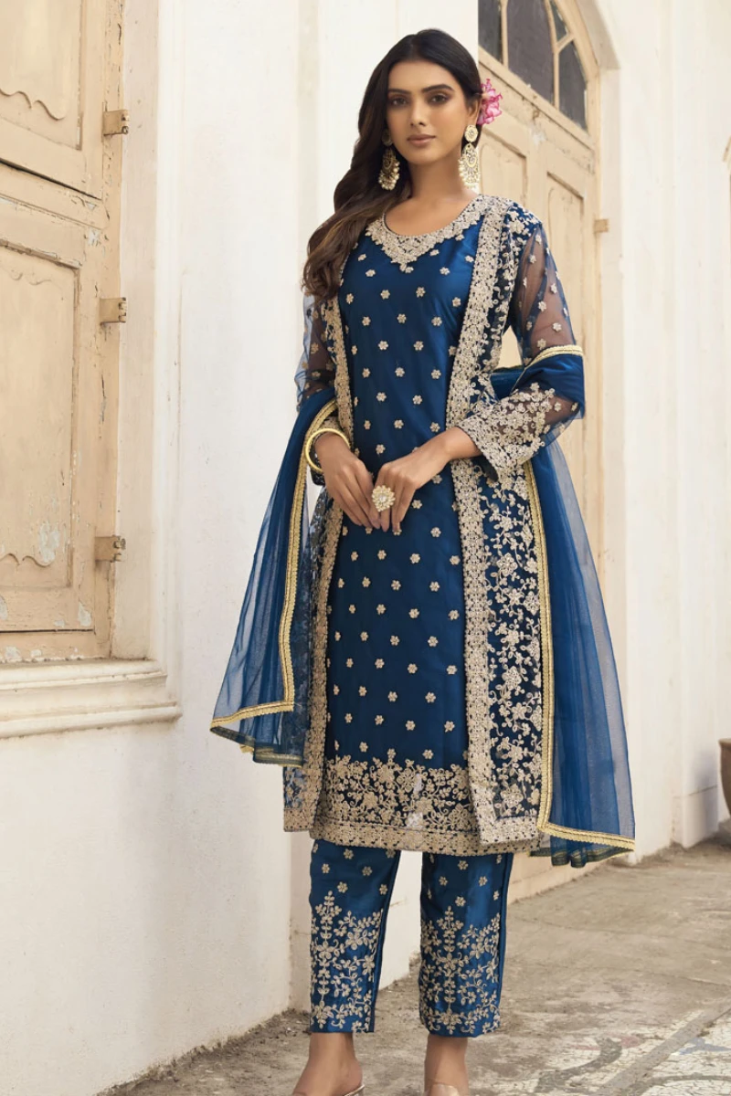 Step into elegance with this Navy Blue Net Embroidered Pakistani Salwar Kameez. The rich net fabric is adorned with fine embroidery, giving the outfit a regal and festive vibe. The a-line style kurta with a round neckline is paired with a matching bottom and dupatta, making it a standout choice for weddings, festive events, and parties.
