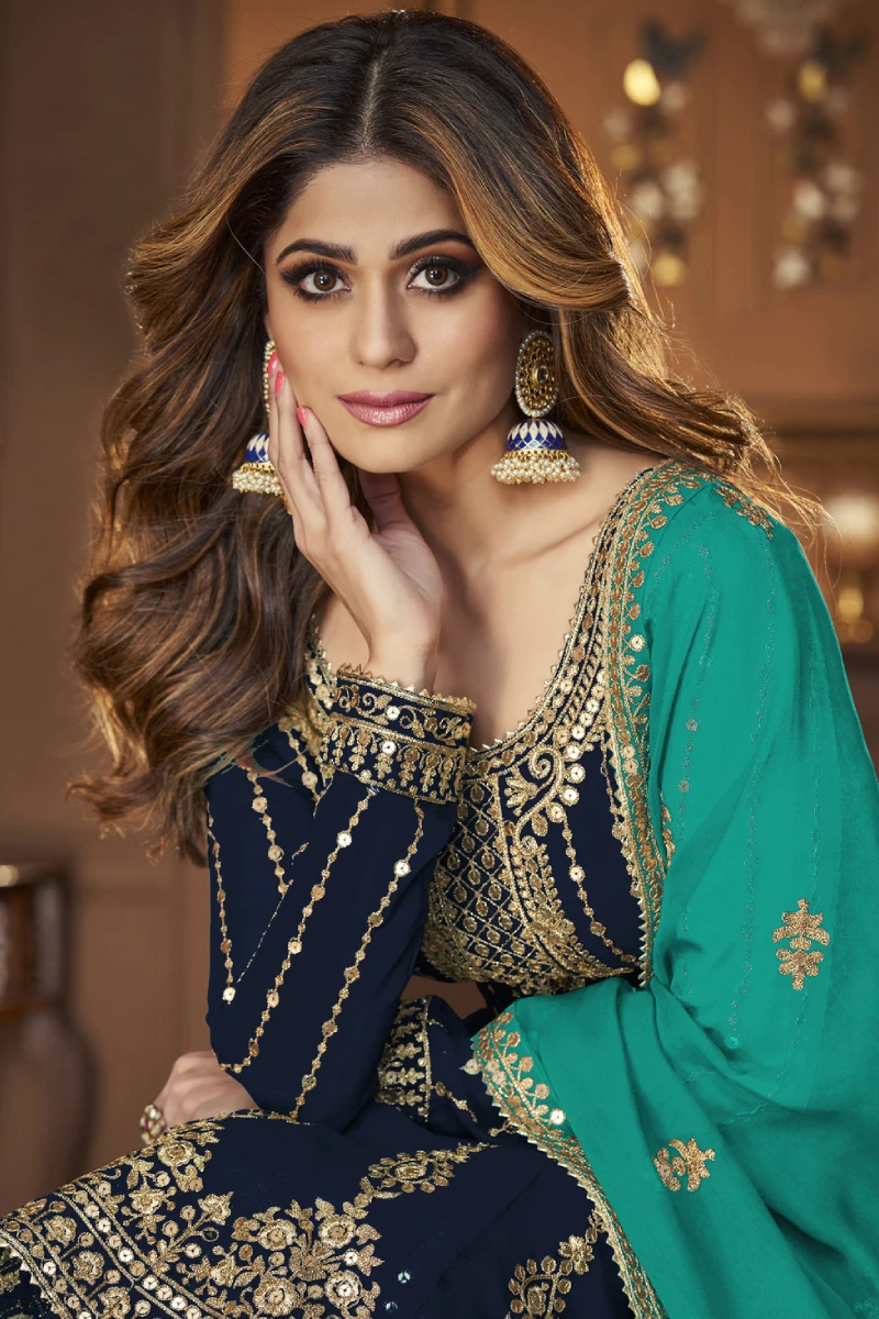 This Navy Blue Skirt Kameez offers a rich and elegant look with its beautifully embroidered pattern, sequins, and zari detailing. The Turquoise Georgette dupatta adds a refreshing contrast, making it a stunning pick for festive evenings and traditional gatherings.