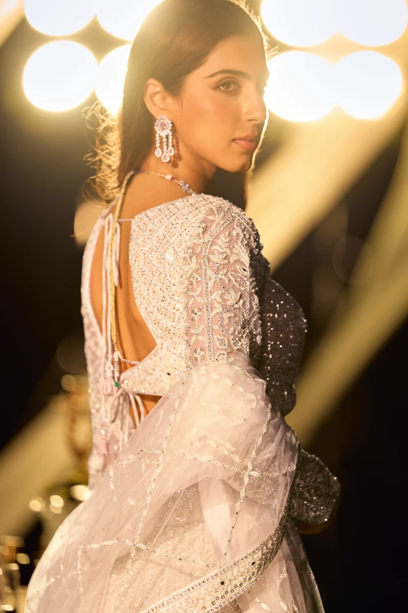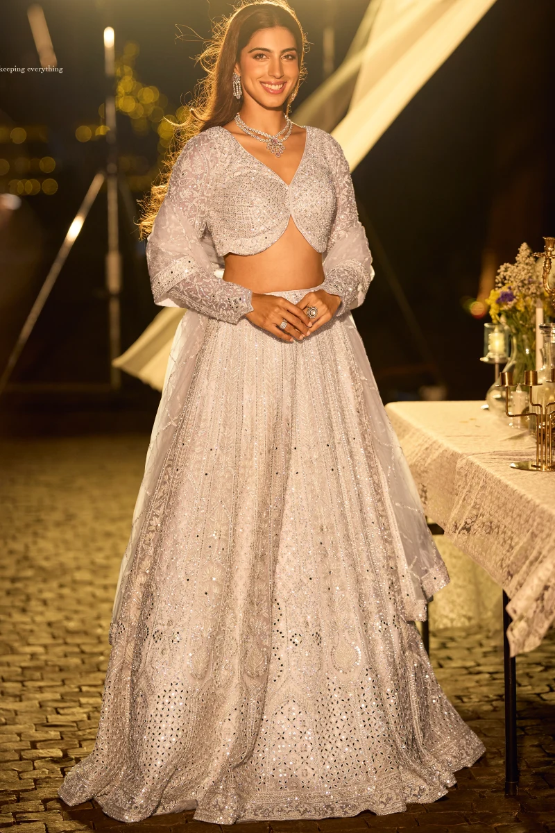 This luxurious off white lehenga choli set is crafted in pure net fabric and richly adorned with heavy hand embroidery. Detailed with beads, pearls, mirror work, and Swarovski hand diamonds, the embroidery covers both front and back for a flawless couture finish. The lehenga is supported with cancan for grand volume, making it a perfect choice for parties, receptions, and high-end celebrations.