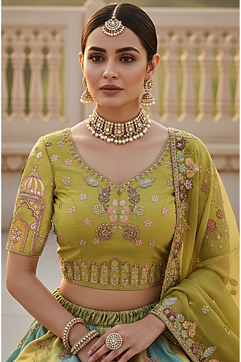 This exquisite heavy embroidered lehenga choli is designed to make a statement at weddings and celebrations. Made from luxurious silk, the lehenga and choli feature detailed embroidery, while the georgette dupatta adds a graceful finish. The olive green choli and dupatta paired with a multicolor lehenga offer a rich and elegant color contrast.