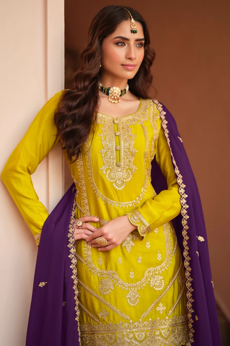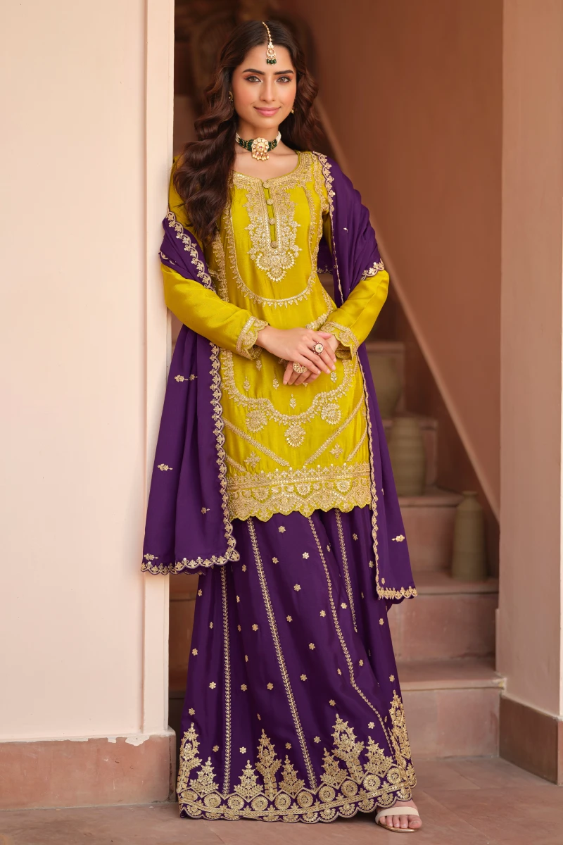 This unique color-combination palazzo suit showcases an olive yellow chinon silk embroidered top paired with a purple chinon silk palazzo and dupatta. Featuring heavy embroidery and a top length of 38–40 inches, this outfit offers a bold yet elegant ethnic look, ideal for festive and party wear.