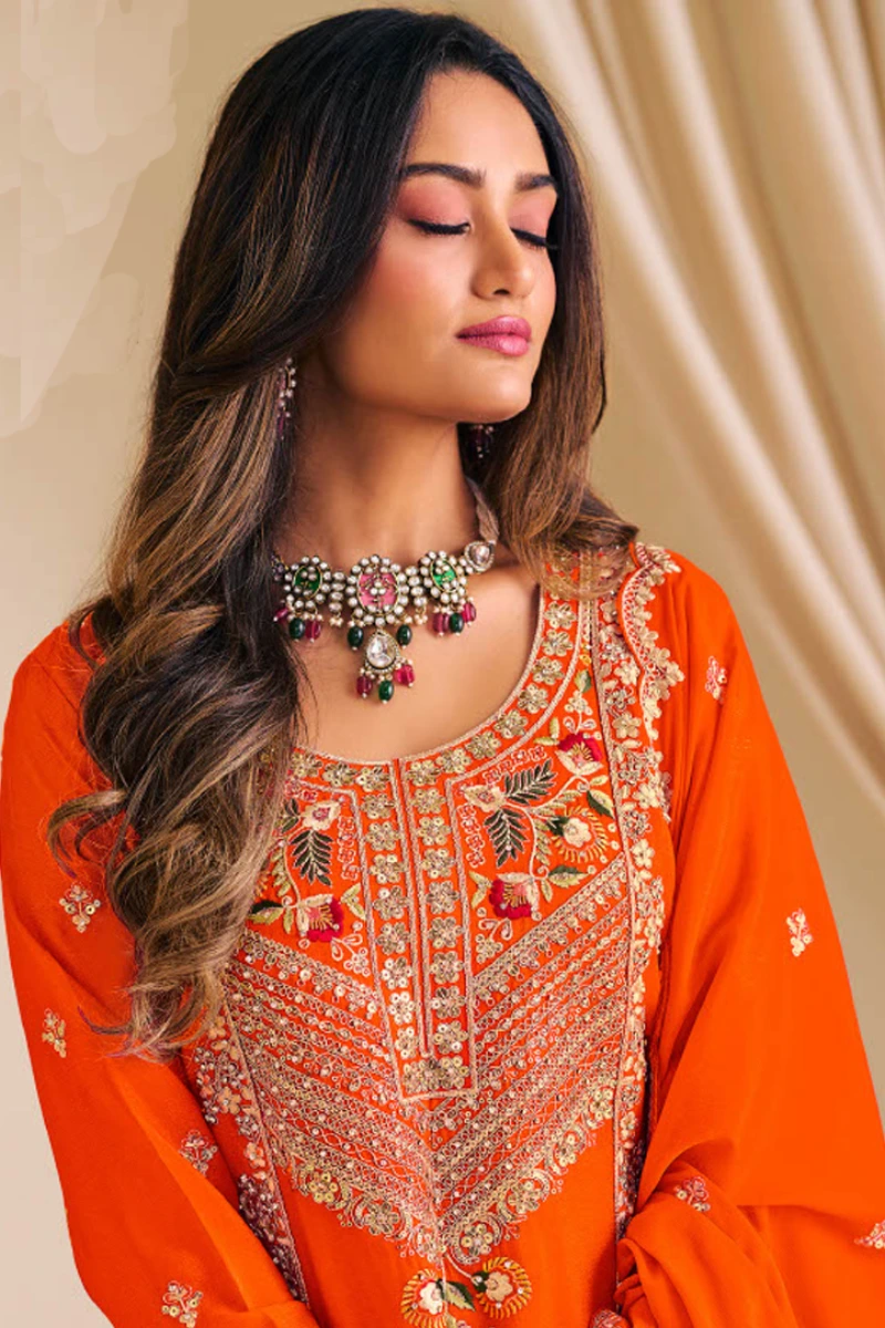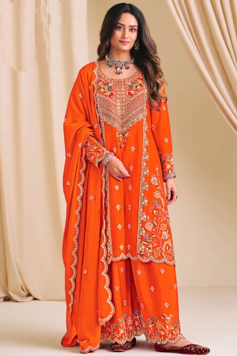 Bring radiance to your celebrations with this vibrant Orange Chinon Silk Palazzo Suit. Adorned with intricate embroidery and shimmering diamond detailing, the ensemble exudes festive elegance. The art silk fabric ensures a rich texture, while the coordinated palazzo and dupatta complete the sophisticated look. Perfect for festive wear, traditional events, or special evening gatherings.