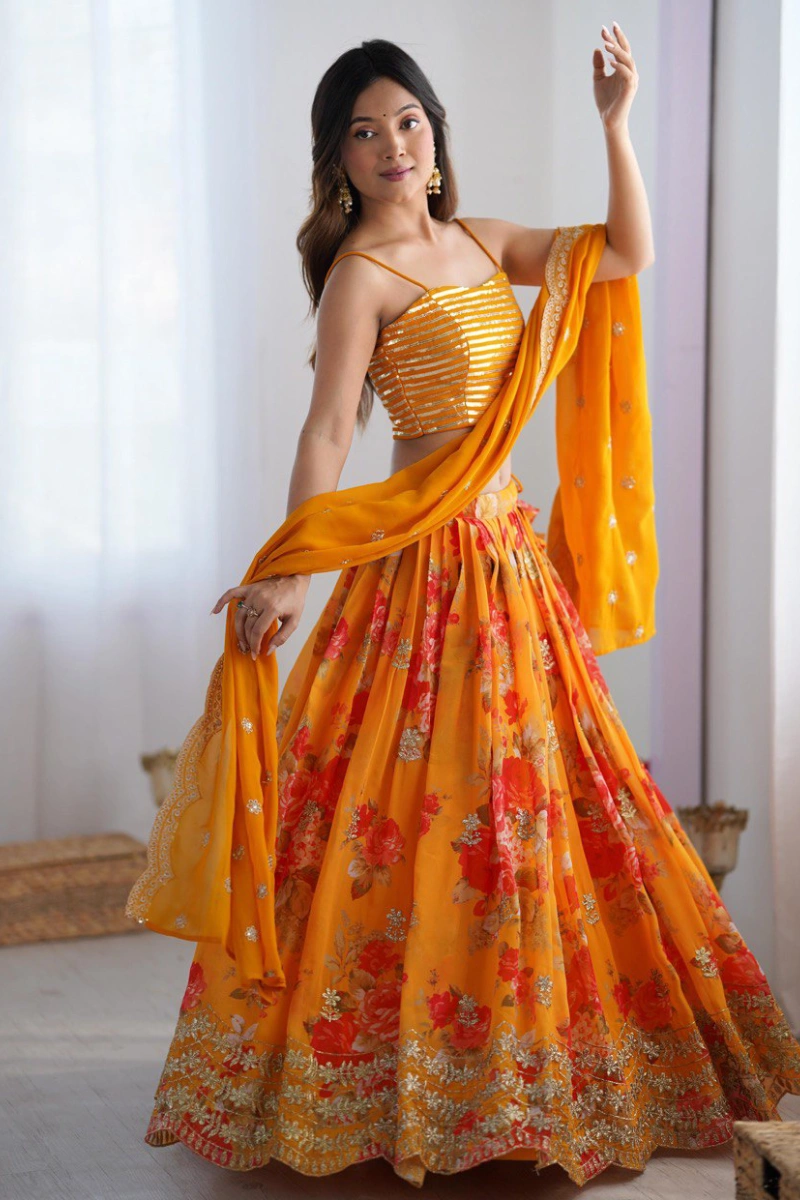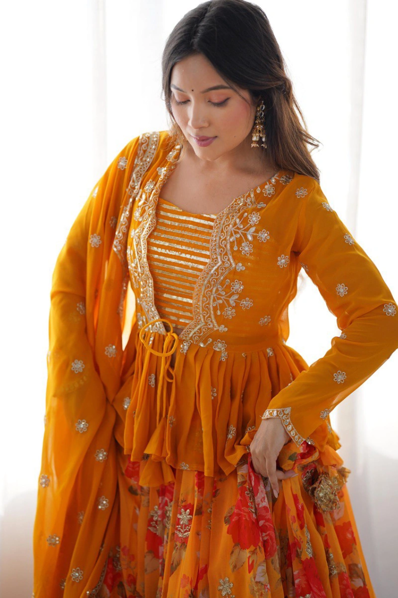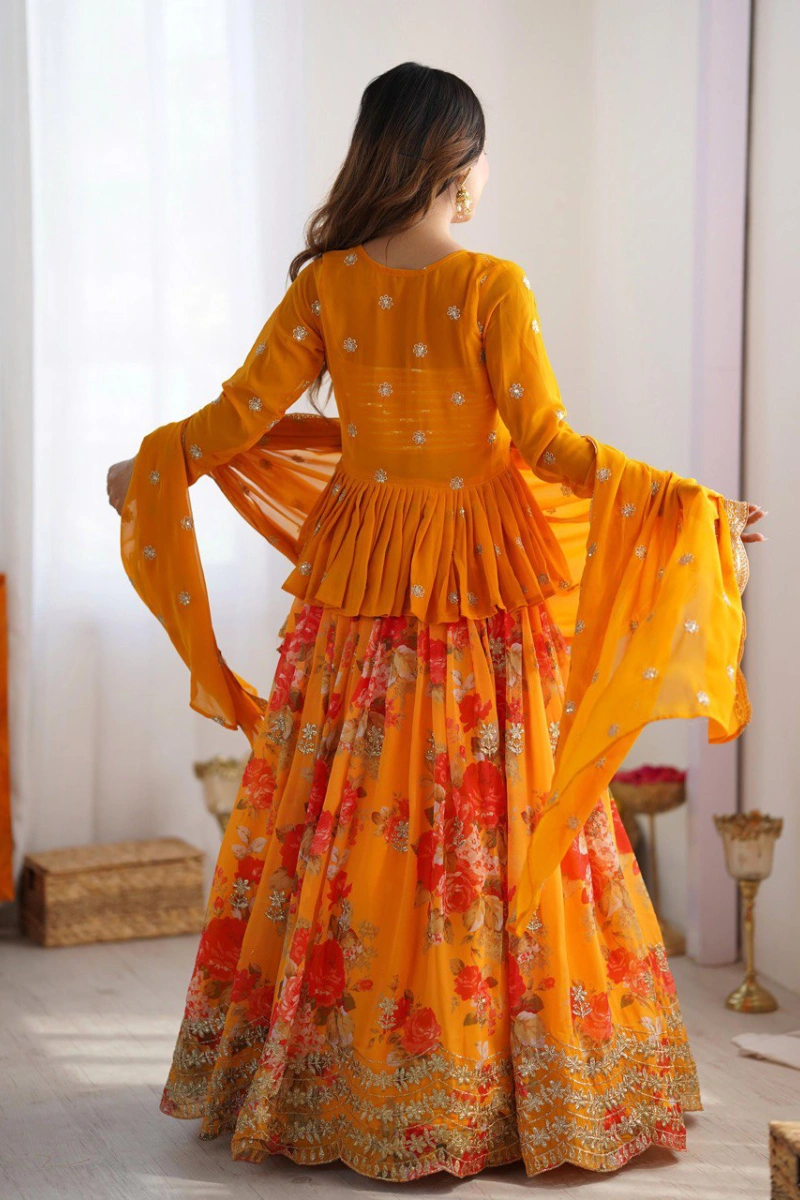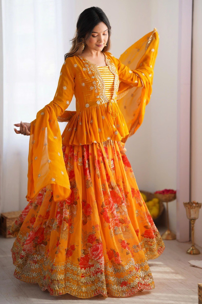 This stunning orange lehenga choli set is crafted in lightweight georgette and enhanced with elegant digital prints and delicate embroidery. Paired with a stylish embroidered jacket and matching dupatta, it offers a perfect blend of contemporary design and festive charm, ideal for weddings, parties, and special occasions.