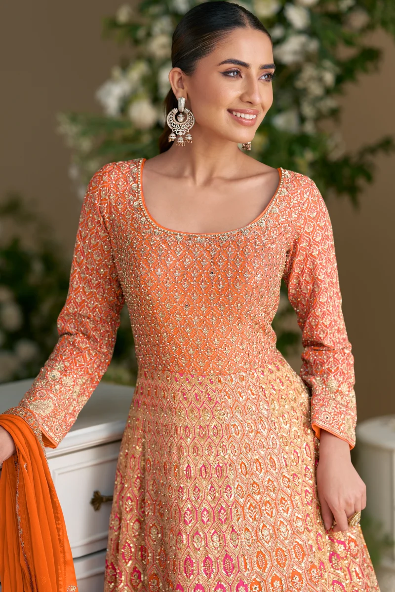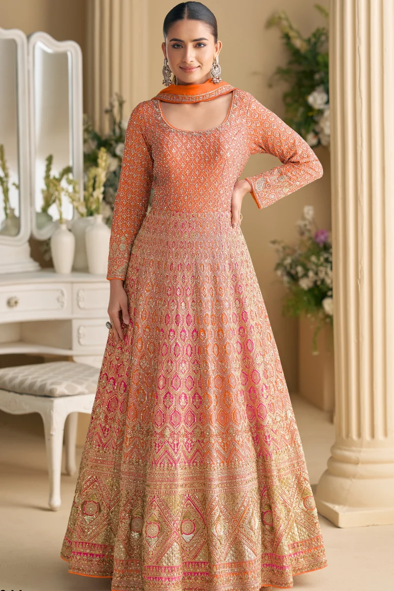 Bright and festive, this Orange Heavy Georgette Anarkali showcases beautiful embroidery and sequins work on a graceful 56-inch silhouette. Paired with a santoon inner and an embroidered heavy georgette dupatta, it is perfect for weddings, festivities, and special occasions.