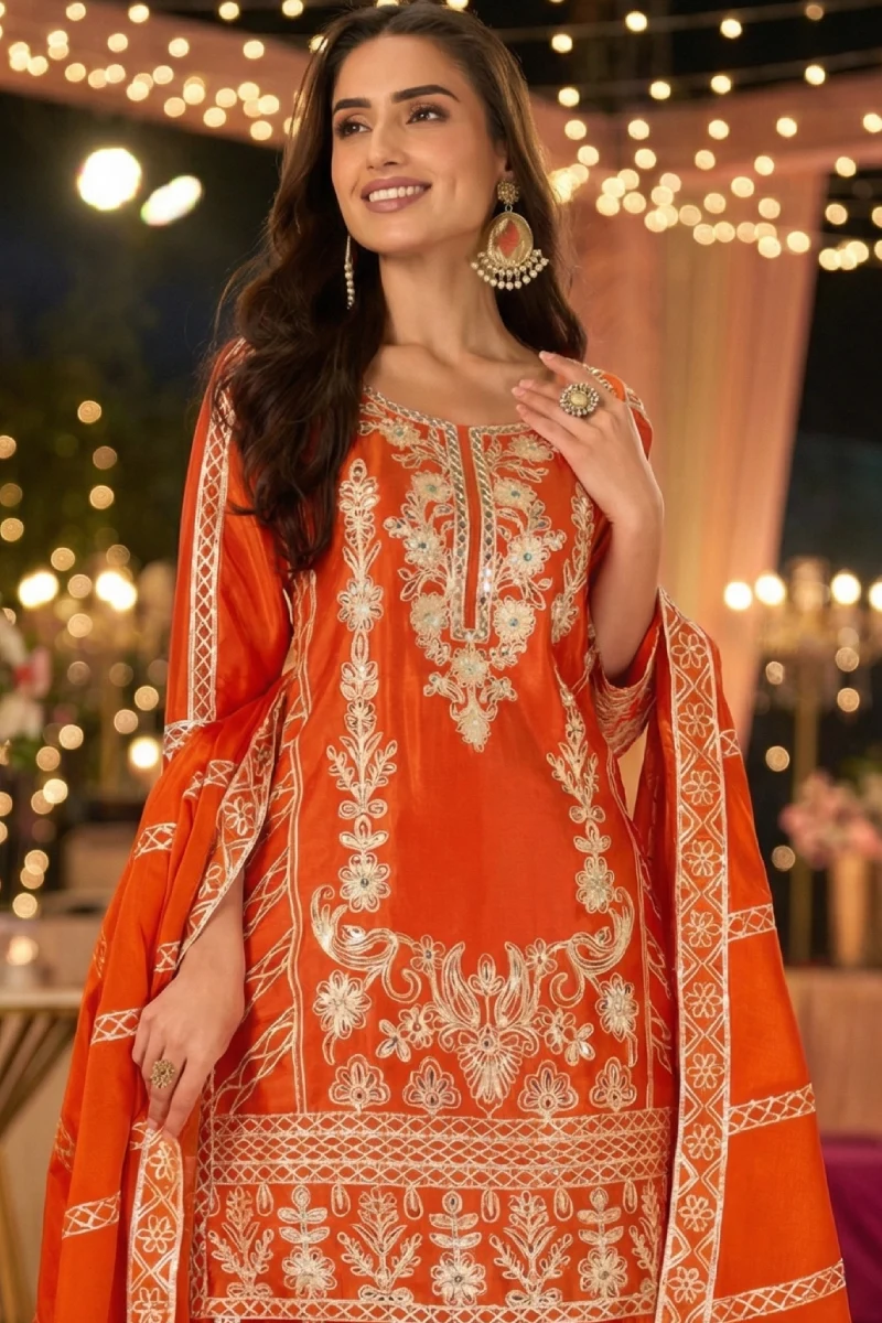 This elegant palazzo suit is crafted in pure chinon fabric, featuring beautiful gota patti work on the top, bottom, and dupatta. The 36-inch top length offers a graceful silhouette, while the matching chinon palazzo ensures comfort with a festive flair. Perfect for weddings, festive occasions, and traditional celebrations, this orange ensemble brings a vibrant and classic ethnic charm.