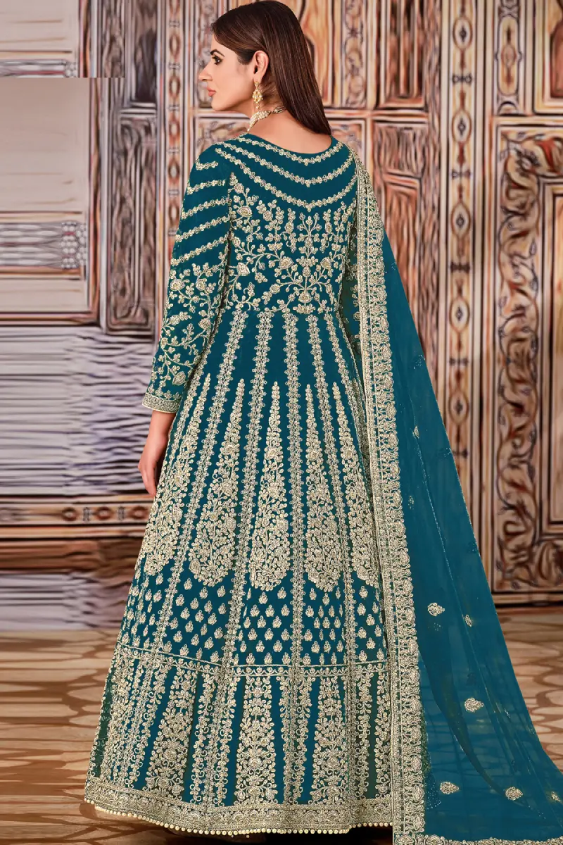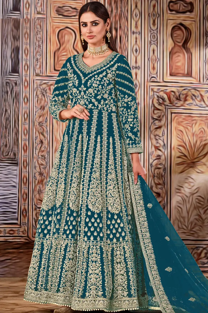 A soft and luminous Peach Anarkali featuring intricate embroidery and shimmering sequins. Its coordinated Net dupatta and santoon bottom add charm to this feminine ethnic outfit.