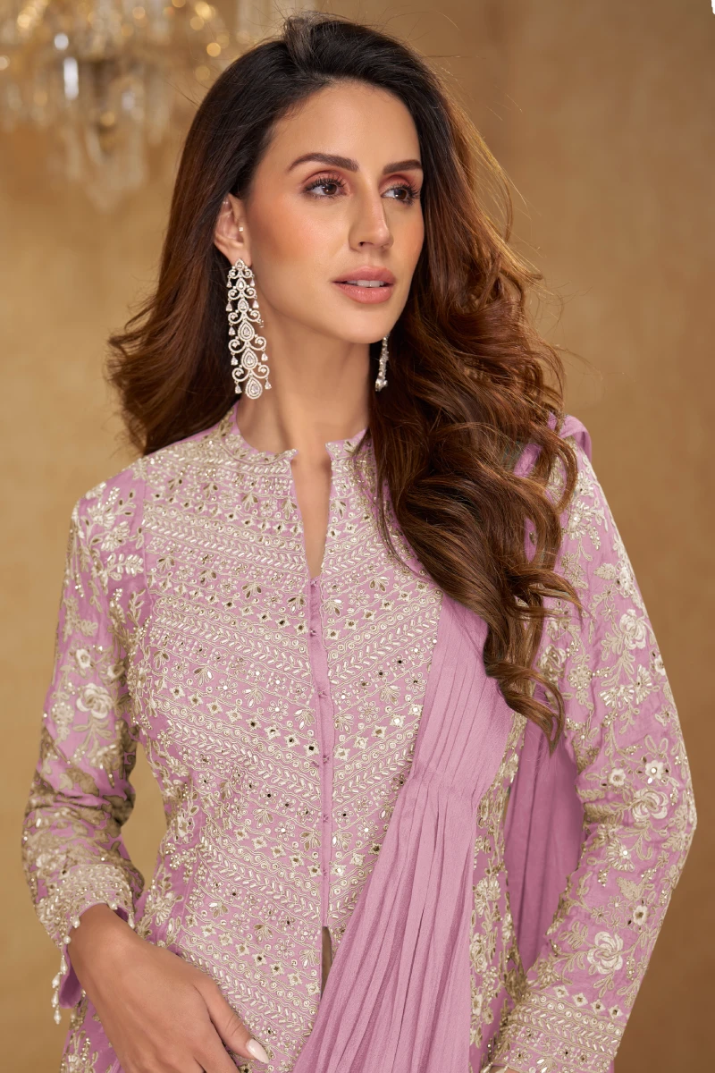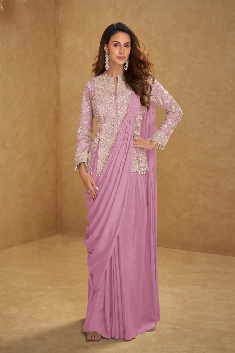 This charming pink skirt style saree set is crafted in soft chinon fabric, featuring a fully embroidered full-sleeve top highlighted with embroidery work and tassels lace. The coordinated chinon bottom and elegant drape create a festive-ready look, perfect for weddings, parties, and ethnic gatherings.