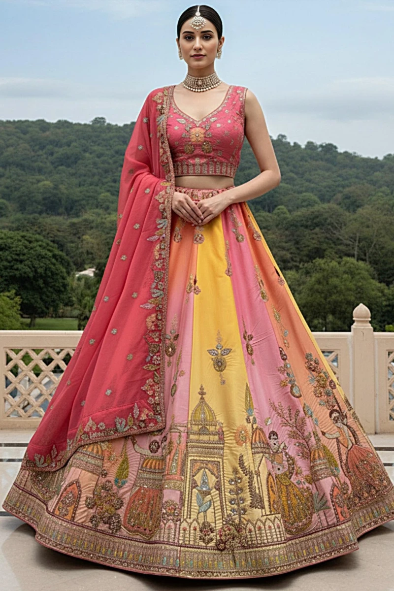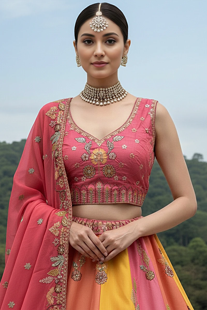 A stunning heavy embroidered lehenga choli set crafted for grand occasions. The silk lehenga and choli are richly adorned with intricate embroidery, paired with a soft georgette dupatta for an elegant drape. The pink choli and dupatta beautifully complement the vibrant multicolor lehenga, creating a striking festive look.