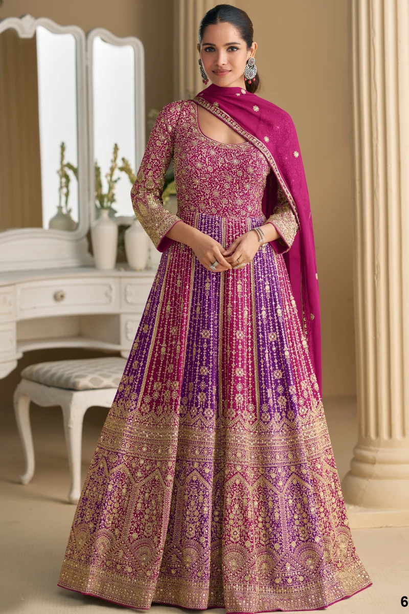 This beautiful Pink Anarkali is crafted from heavy georgette and adorned with rich embroidery and sequins detailing. Designed with a 56-inch length and santoon lining, it comes with a matching embroidered dupatta, making it an ideal choice for festive and party wear.