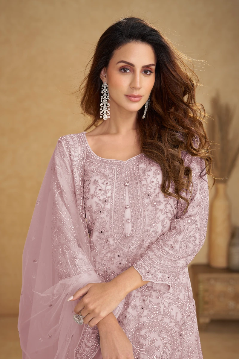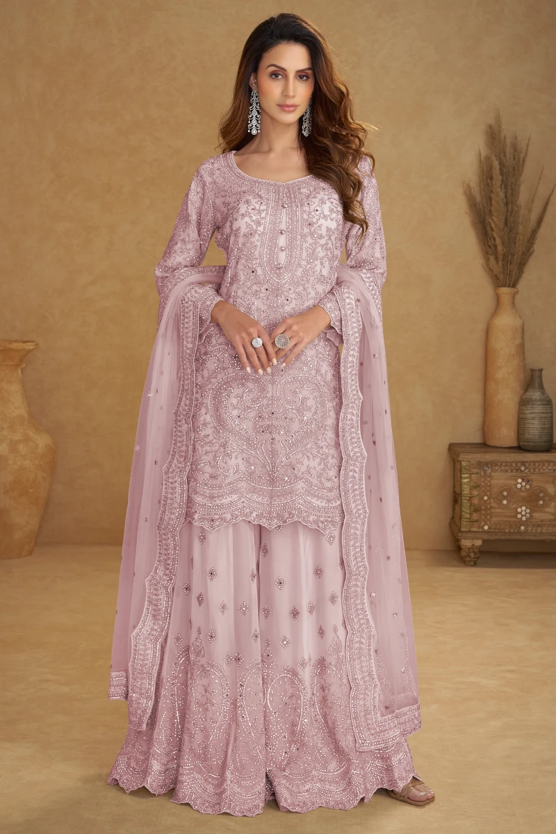 Designed in a soft pink hue, this palazzo suit features a real net top and dupatta with a pure net palazzo. Detailed with fine embroidery and hand work, it creates a refined ethnic look with a modern touch. The 38–40 inch top length adds elegance, perfect for festive celebrations and evening functions.