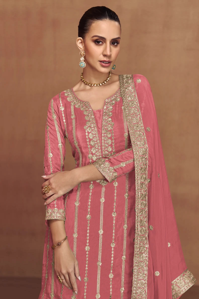 Elegant pink Simar Silk palazzo suit featuring intricate embroidery on a 40″ full-sleeved top. Paired with matching palazzo and dupatta for a refined festive and party look.