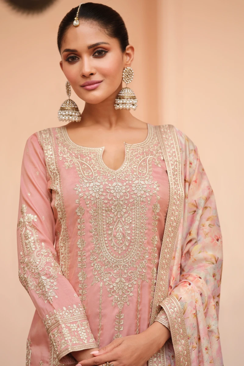 This elegant pink Simar Silk palazzo suit features beautiful embroidery on a full-sleeved 44″ top paired with matching palazzo and dupatta. A perfect combination of style and grace for festive and wedding occasions.