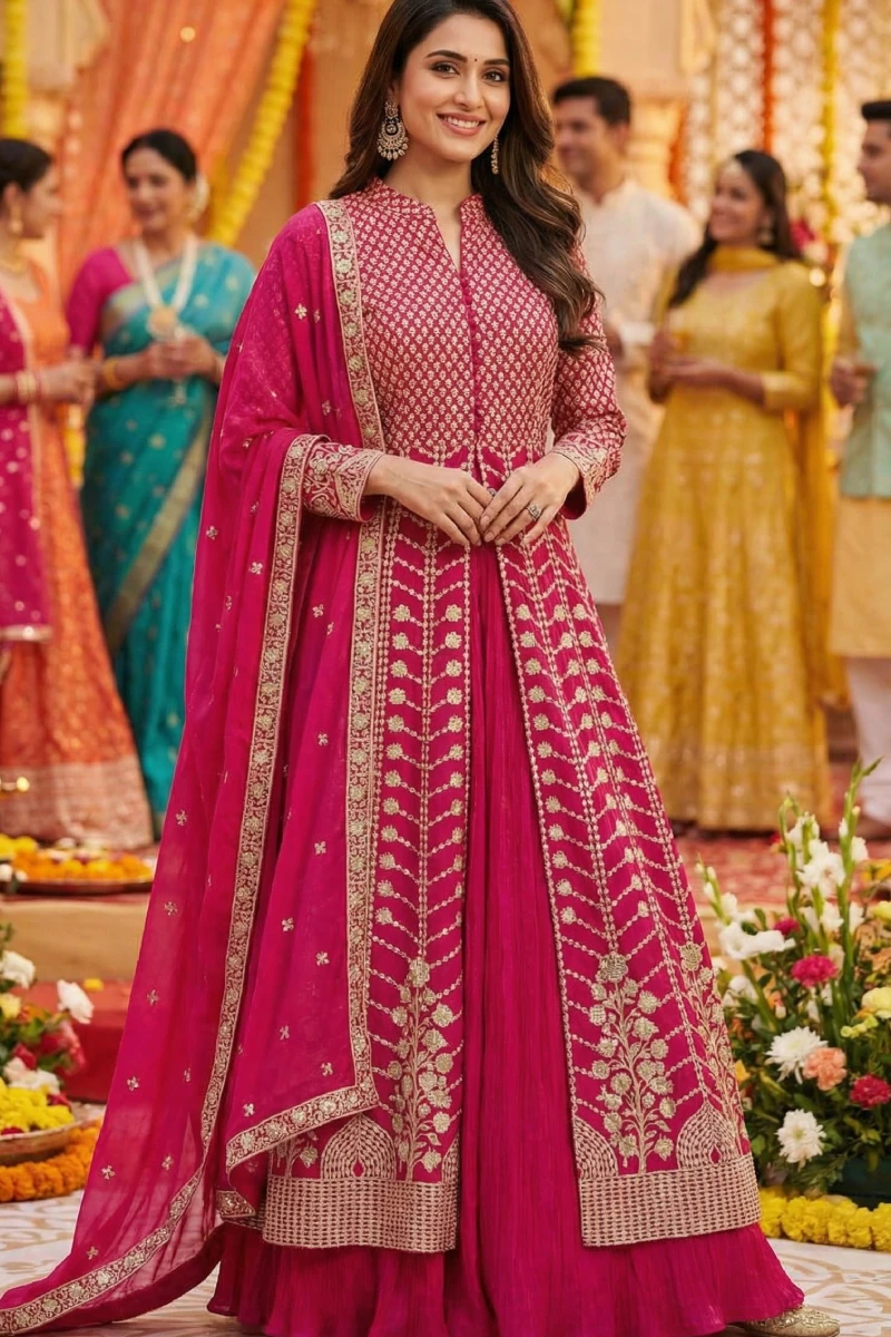Vibrant and elegant, this Pinkish Red Anarkali set features a fully embroidered slit style top crafted in georgette. Paired with a matching skirt and dupatta, the flowing 52–53 inch silhouette makes it a perfect choice for weddings, parties, and festive celebrations.