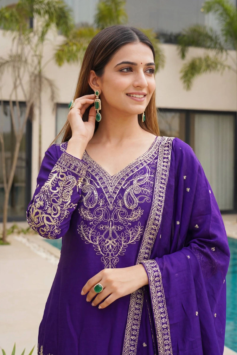 This beautiful purple Chinon palazzo suit features intricate embroidery and a coordinated dupatta. With a 40-inch top length, it blends sophistication and style, making it ideal for celebrations and special occasions.