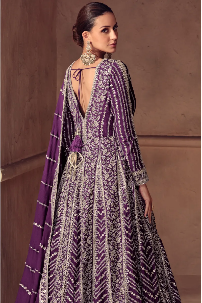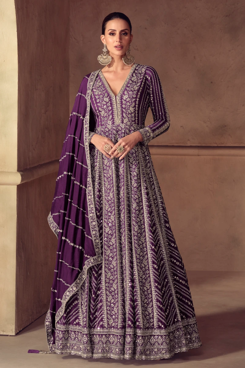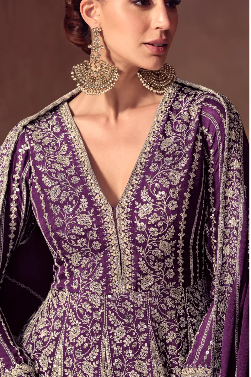 This Purple Designer Anarkali features luxurious embroidery on premium Chinon Silk with a stylish V-neck pattern. The 44-inch long flared silhouette is paired with a matching dupatta and santoon lining, making it perfect for receptions, parties, and festive celebrations.